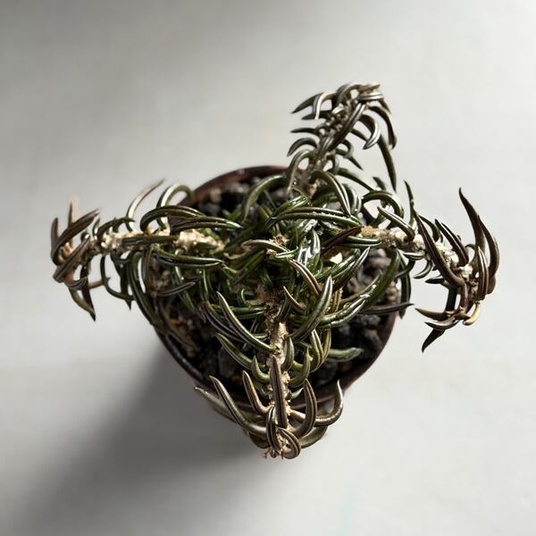 筒状になった葉が地を這うように伸びる様が魅力的で鈍いダークグリーンをした葉は、やや多肉質で人気の多肉植物です。根は塊根で、盆栽型としても楽しめます。