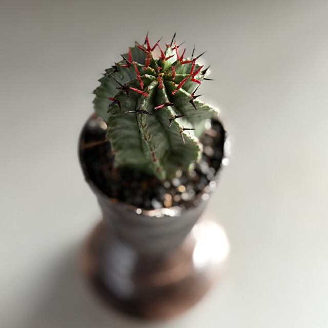 南アフリカの東ケープ州原産のトウダイグサ科ユーフォルビア属の多肉植物です。サボテンのような白い肌と、開花後に残る硬くて長い刺が特徴の強健な品種です。球形〜円柱状に生長し、迫力のある外見からインテリアとして人気があります。 赤棘が美しい。珍奇植物の一つとしてコレクションにおすすめです。1点モノ系の鉢植えとして飾れます。
